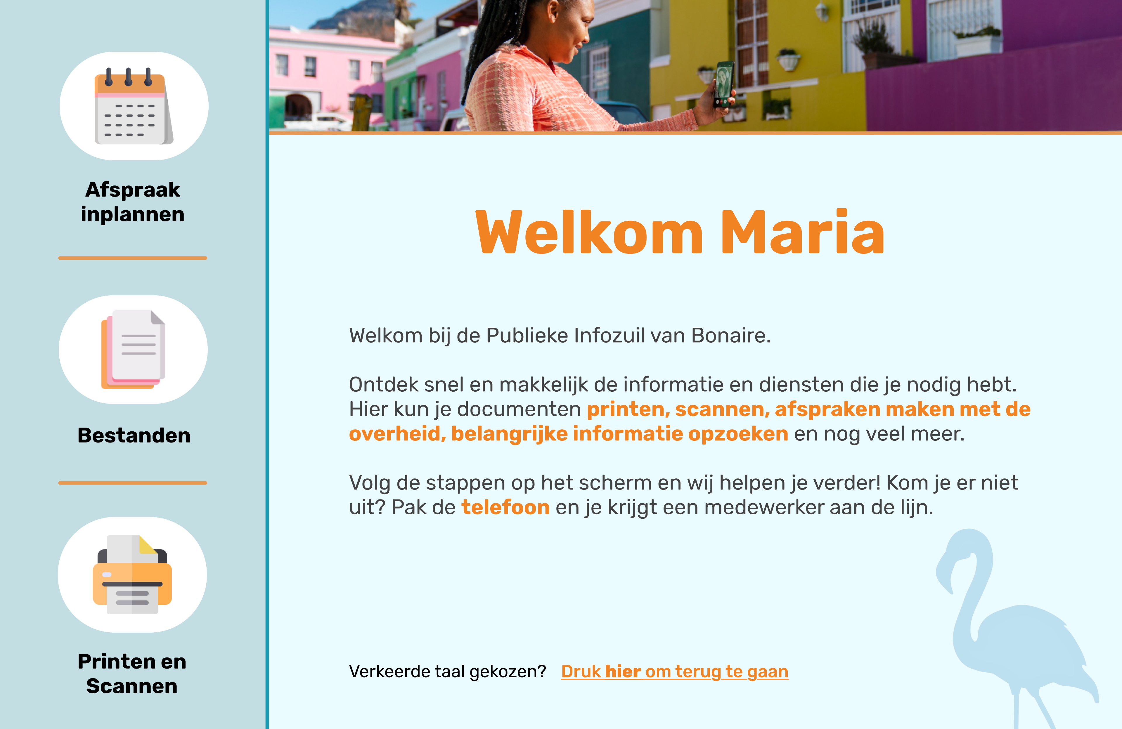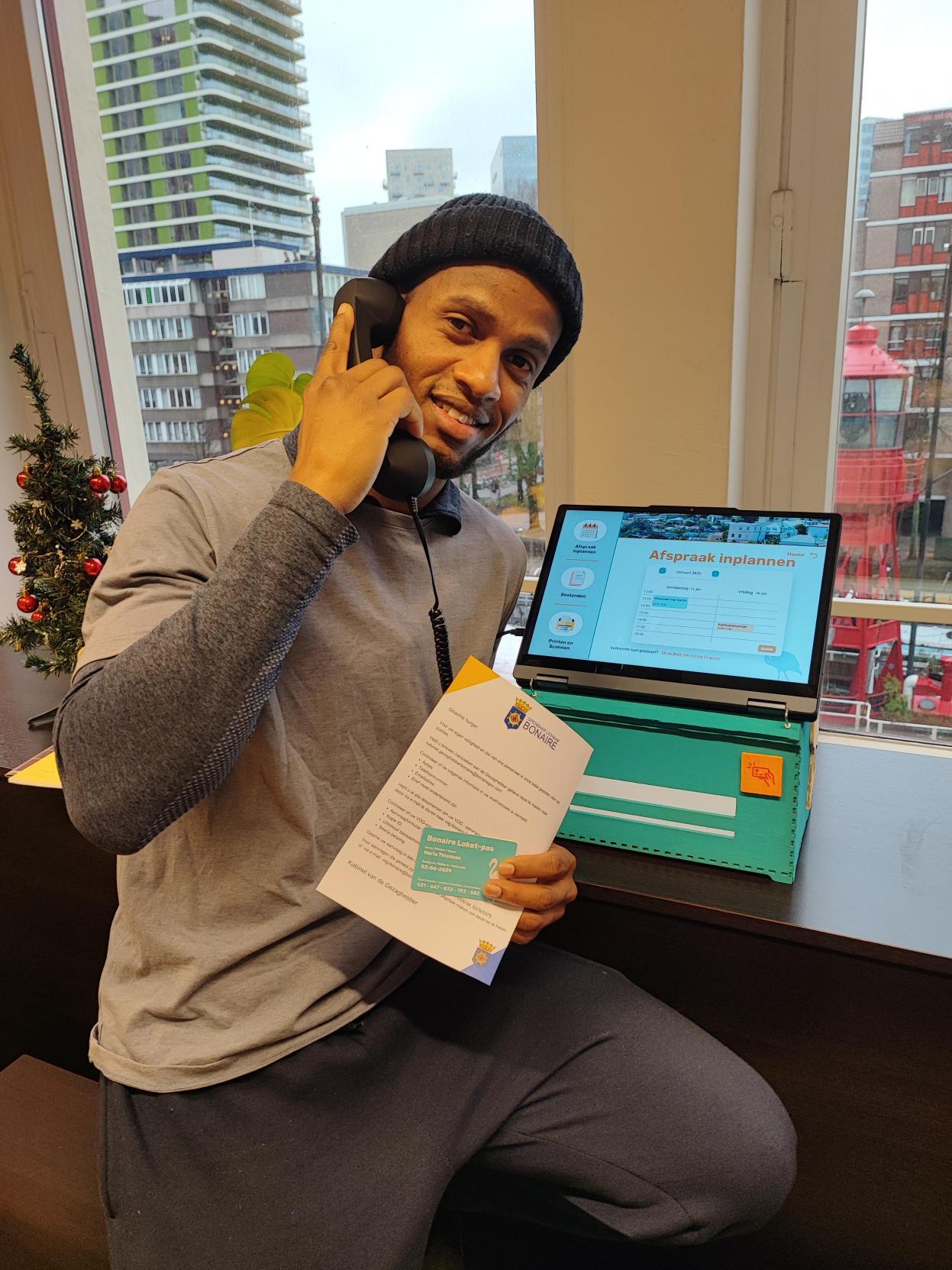 Ook hebben we wat fysieke elementen verbeterd: de hoorn geeft nu geluid! Hou de hoorn bij je oren en luister naar onze behulpzame medewerker. Ook is het verkrijgen van de Bonaire Pas nu wat makkelijker. Nadat de gebruiker een paar simpele persoonlijke gegevens invoert, print de kiosk het gepersonaliseerde pasje meteen uit.